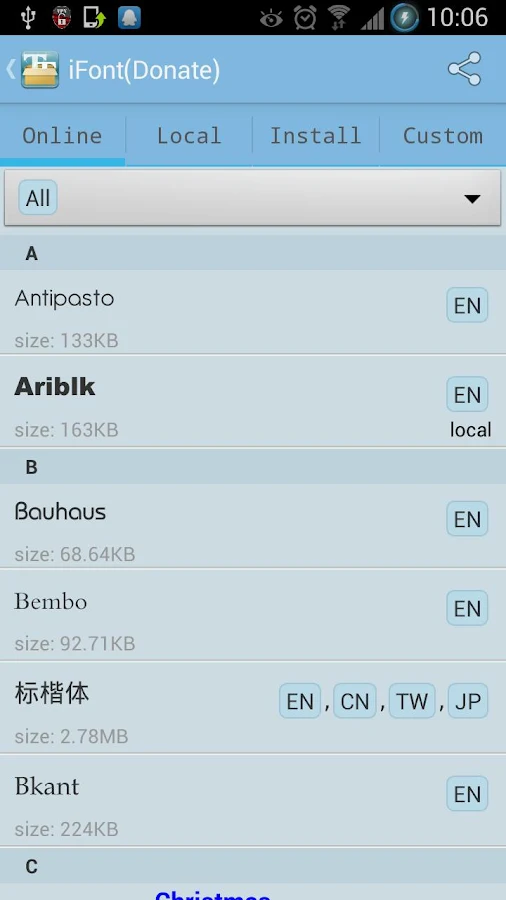 Aplikasi tersebut mempunyai himpunan font yang menarik. Antaranya, Open Sans, Helvetica Neue, Exo, dan lain-lain lagi. Aplikasi yang saya muat turun sebelum ini hanya terhad kepada tiga muat turun sehari. Hanya tiga jenis font yang boleh saya muat turun dalam sehari.